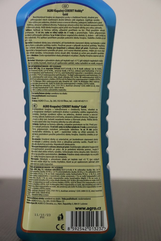 - AGRO Cererit Hobby Gold je kapalné minerální bezchloridové hnojivo s mikroprvky