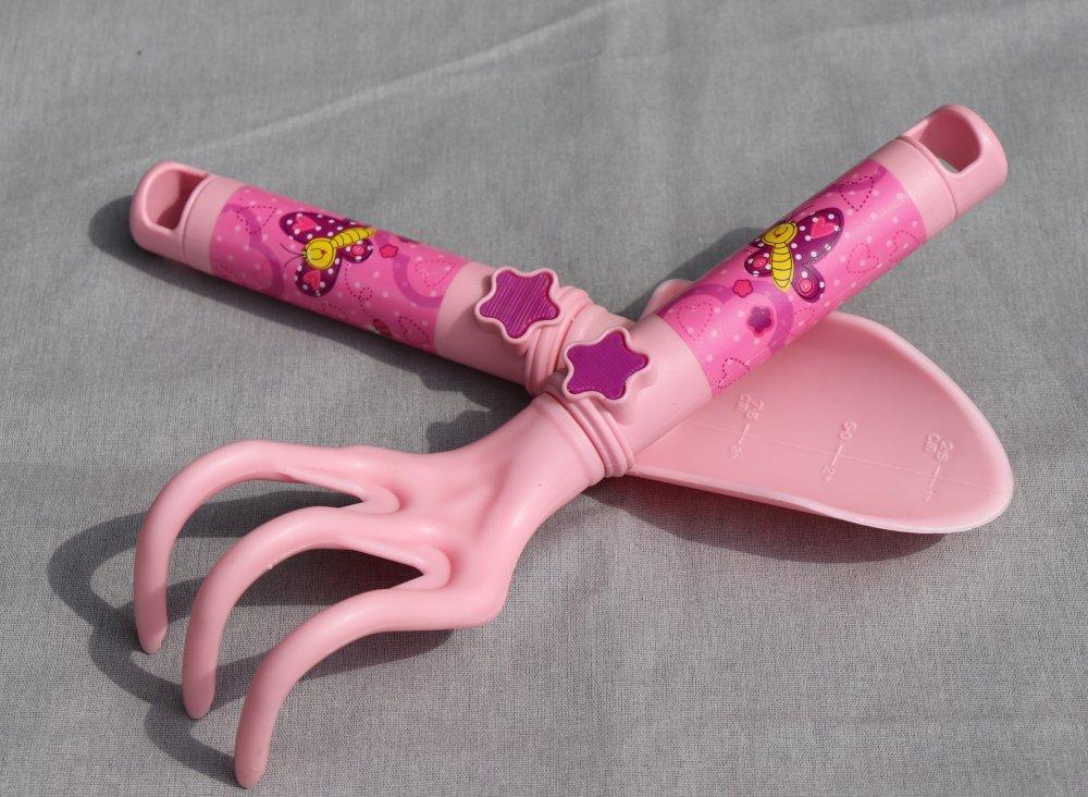 • Sada dětského nářadí v růžové barvě - 3-zubé hrabičky + lopatička s násadou s dětskými motivy.