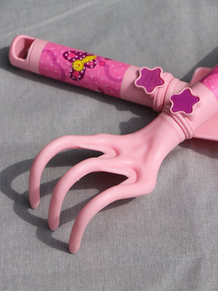 Sada dětského nářadí v růžové barvě - 3-zubé hrabičky + lopatička s násadou.
