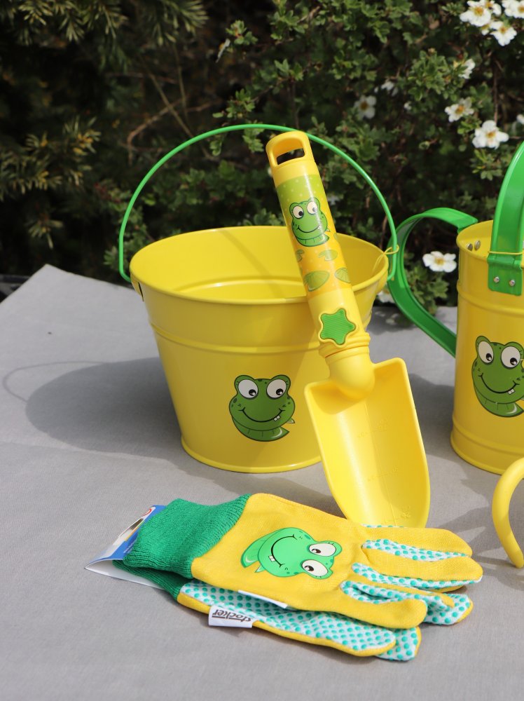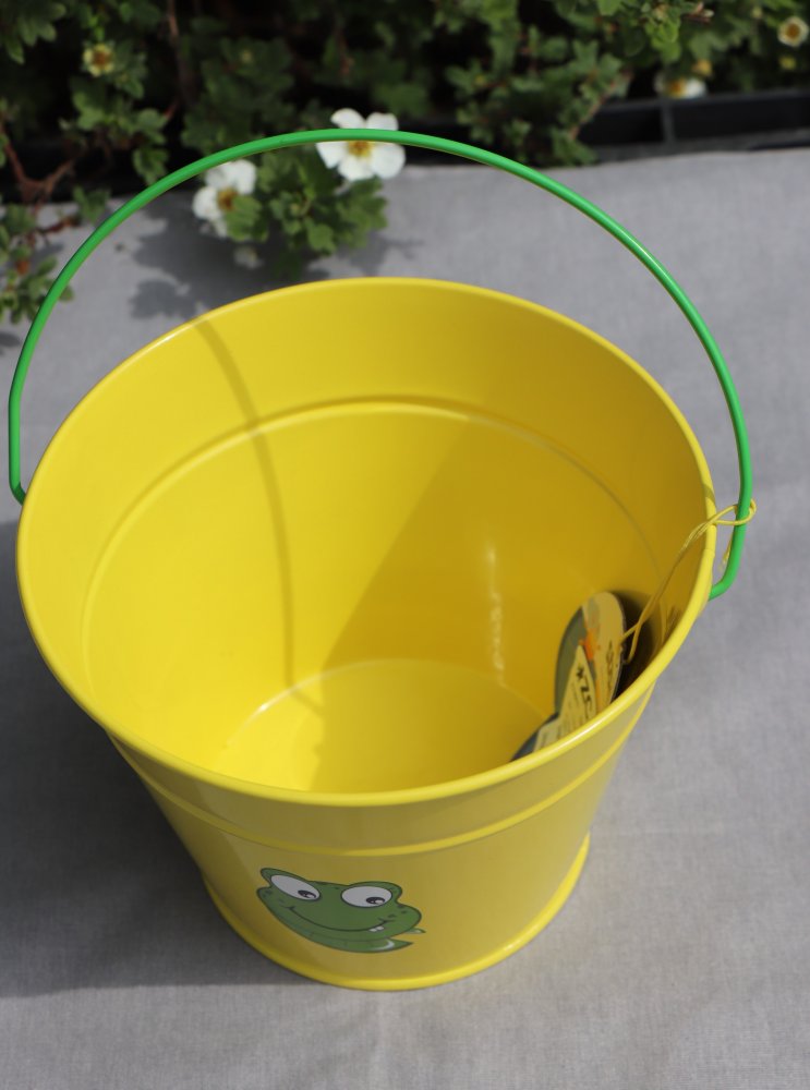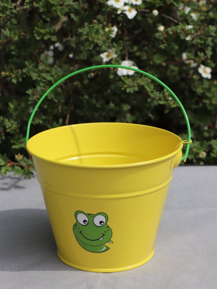 • Dětský kovový kyblík ve žluté barvě s obrázkem s dětským motivem.