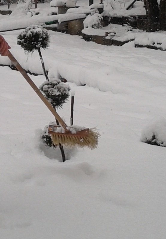 Při silném zasněžení se mohou mladé stromky nebo keře pod tíhou sněhu snadno rozlomit, proto je vhodné košťátkem omést sníh z větví nebo lehkým poklepáním setřást sněhovou pokrývku.