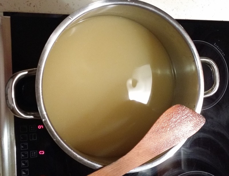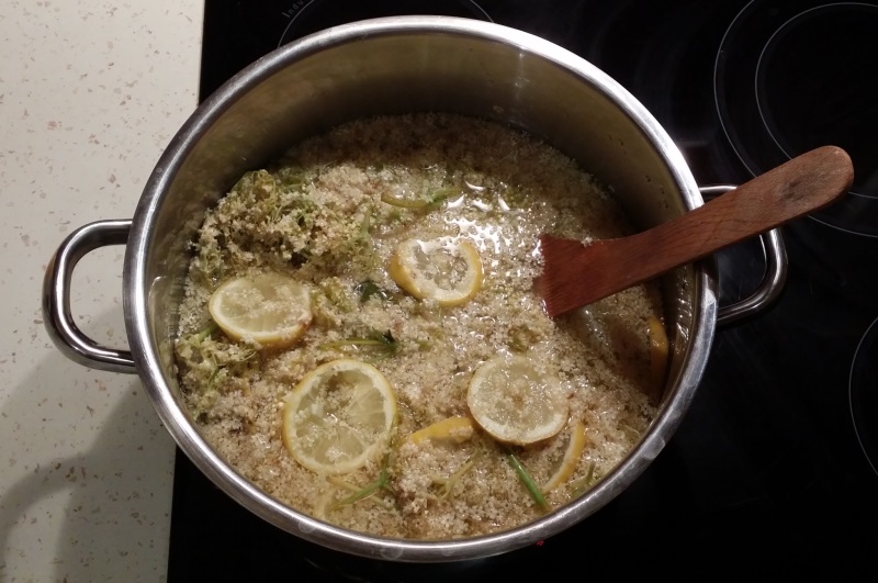Po vyluhování tekutinu scedíme přes cedník a přidáme cukr a necháme směs mírně zahřát, aby se cukr zcela rozpustil, a ze dna hrnce začnou k hladině stoupat bublinky.