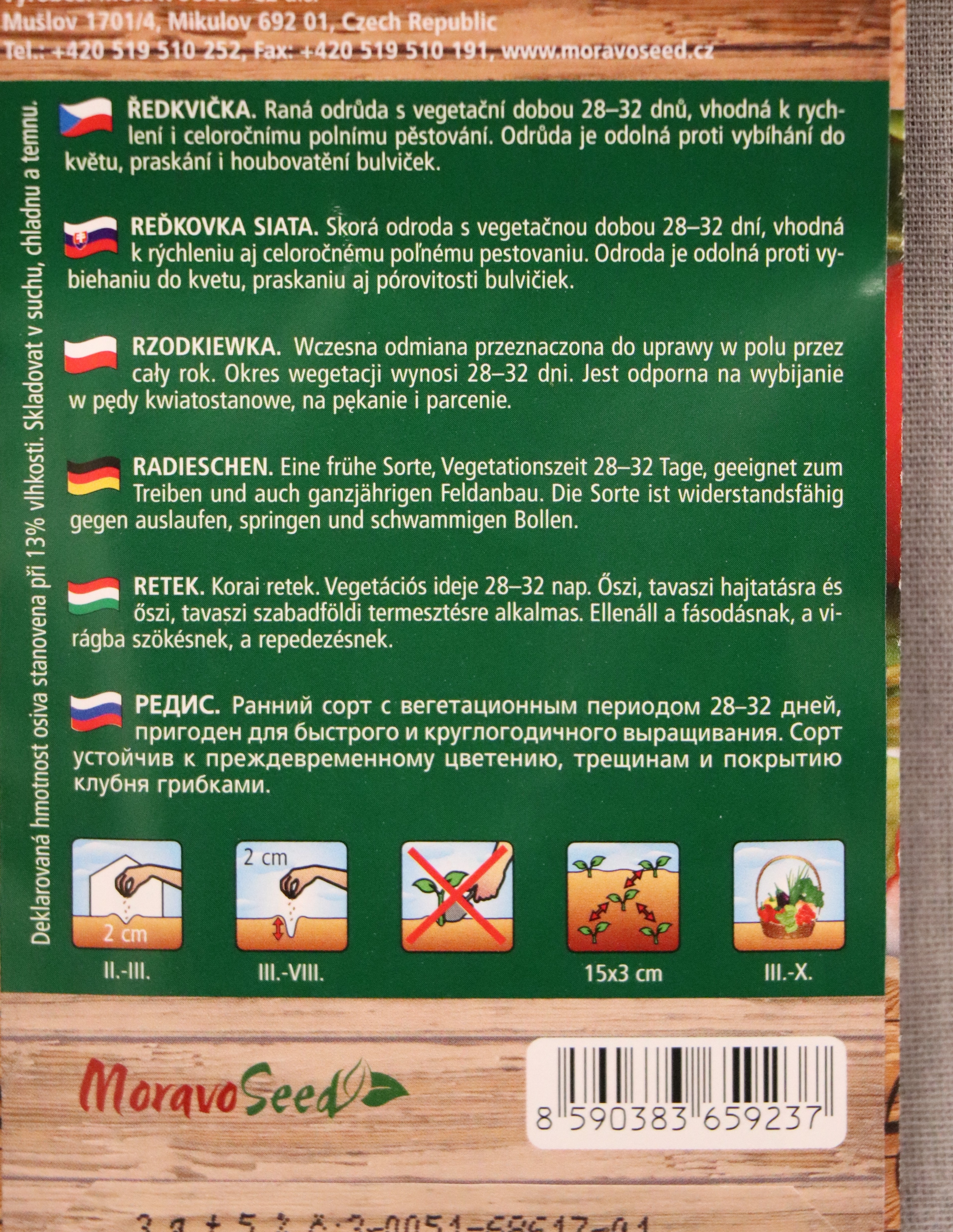 Je to raná odrůda určená pro rychlení i celoroční polní pěstování. Vyznačuje se vysokou odolností proti vybíhání do květu a zároveń i odolností praskání bulviček a houbovatění. Bulvičky jsou větší, kulovité s jasně šarlatovou červenou barvou. Její vegetační doba je 31 - 34 dní.