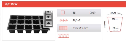 Po přesazení z buněk 3 - 4 cm. Pro kvalitní sazenice paprik, rajčat, okurek. Velkou výhodou je větší odstup buněk od sebe, listy rostlinek se více rozloží a jsou silnější rostliny. Velký otvor dna a speciální vzdálenosti způsobují dobré provzdušnění kořenů. Vhodný pro napěstování sazenic trvalek, před vysazováním na záhony. K dopěstování paprik do 3-4 pravých lístků před výsadbou do skleníku, nebo foliáku. Sadbovač využijete také k rychlení rajčat do výšky tak 20-25 cm.