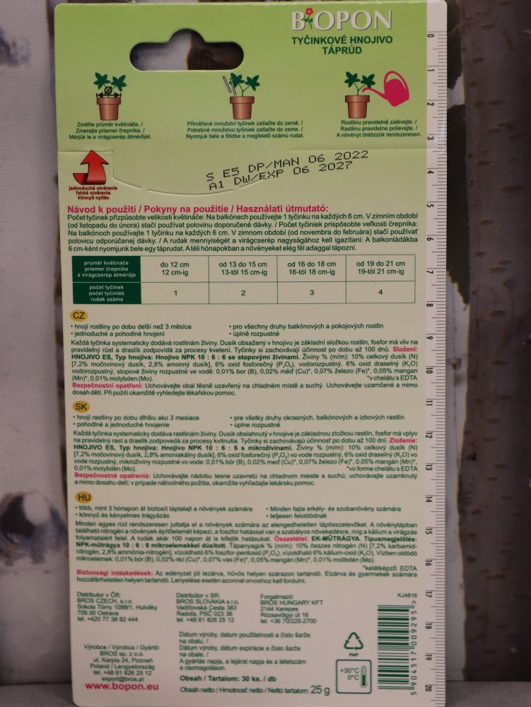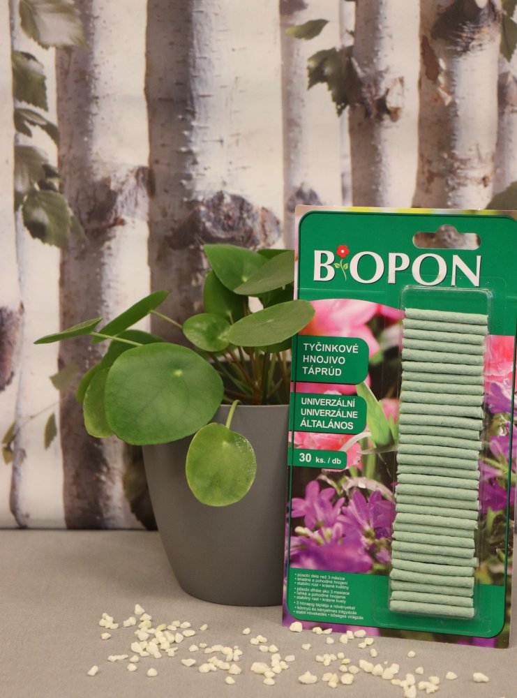 - Univerzální hnojivové tyčinky Biopon dodávají rostlině živiny po dobu 2 měsíců, jsou plně rozpustné.