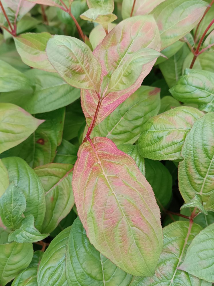 - listy sou velké, lesklé, z jara jsou zelené s bronzovo - červeným tónem a na podzim přebarví do vínově červené barvy