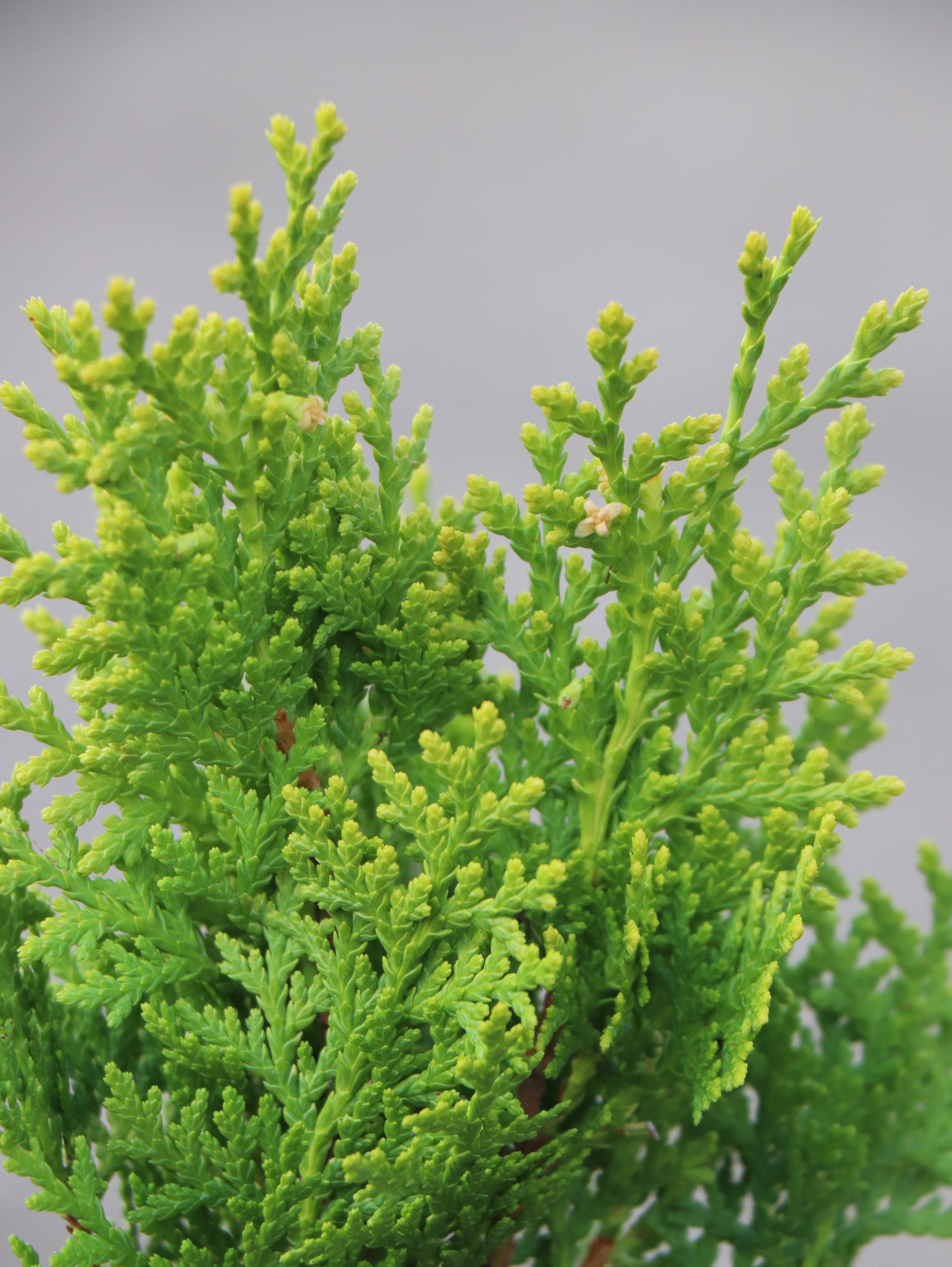 Kulovitě až kuželovitě, pomalu rostoucí kultivar. Mladé výhony při rašení intenzivně vybarvují do žluté až oranžově-žluté barvy. V létě vybarvení přechází do zeleno-žlutých odstínů a v zimě přechází do oranžově hnědavých tónů. Jehlice jsou ploché a šupinovité. Větve jsou svisle a hustě vedle sebe srovnané, čímž dodávají stromku žebernatý vzhled.